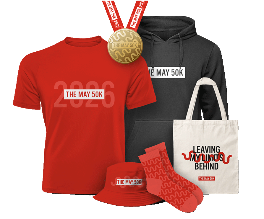 Every fundraising milestone you hit unlocks exclusive The May 50K merch to celebrate your effort. Score a tote bag, t-shirt, bucket hat, hoodie, or medal as you go – each one a reminder that you're helping create a future free of MS.